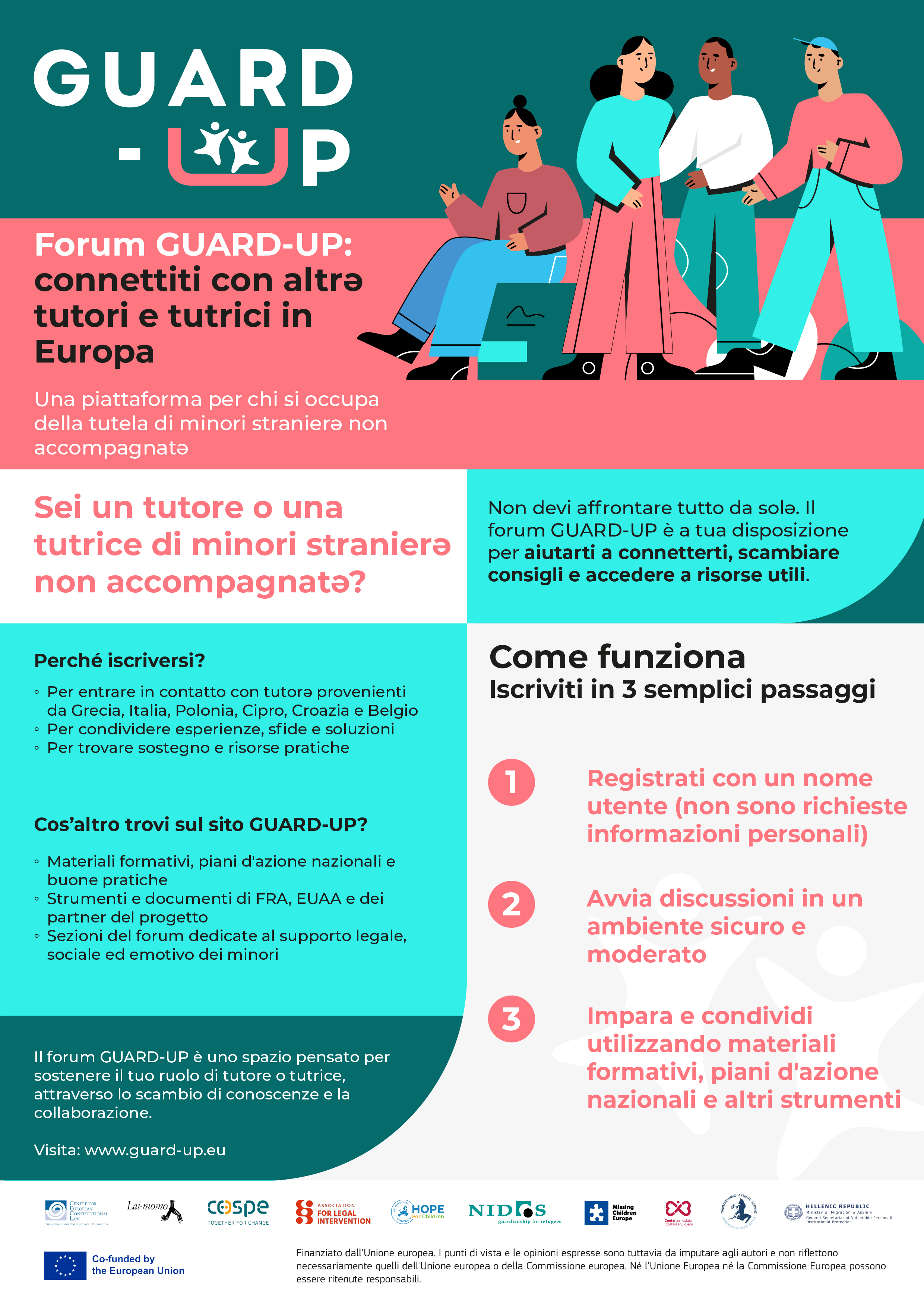 Il Forum GUARD-UP è lo spazio online dedicato alle e ai tutori/tutrici di minori migranti non accompagnatə (MSNA), pensato per favorire il confronto, la condivisione di esperienze e il supporto reciproco tra professionistə della tutela.